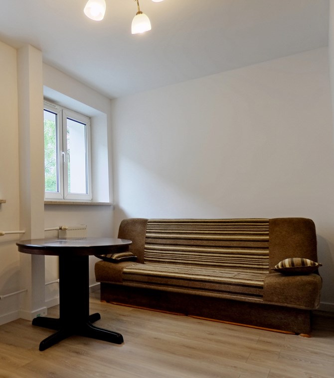 Salon: kanapa rozkładana, stół.