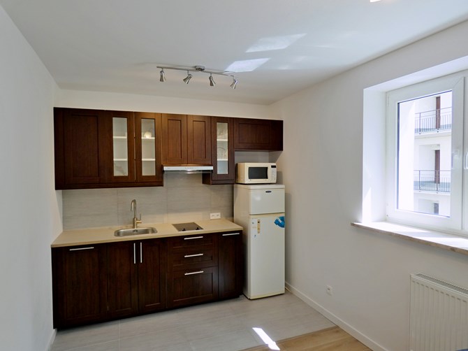 Kuchnia: lodówko-zamrażarka, okap, 2-palnikowa płyta ceramiczna, zmywarka, mikrofalówka, zlew.