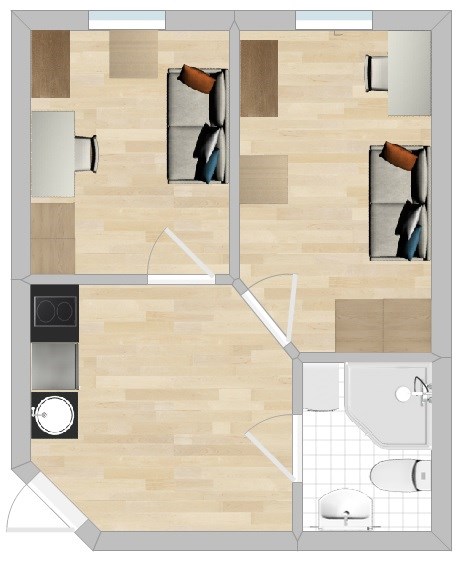 *W pierwszym pokoju znajduje się szafa, biurko, stolik, rozkładana sofa i komoda.