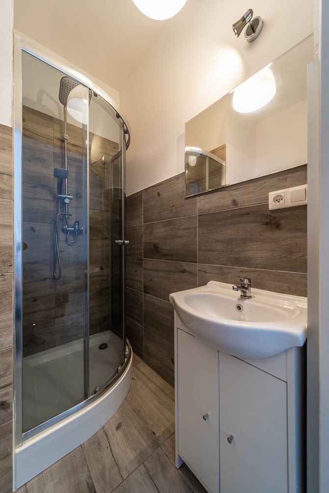 Łazienka: kabina prysznicowa, umywalka, WC.