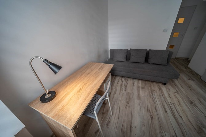 Pokój: rozkładana kanapa, biurko, krzesło.