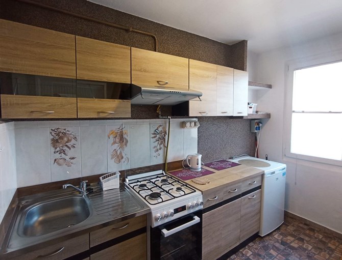 Kuchnia: kuchenka, piekarnik, lodówka, szafki dolne i górne, stół z taboretami.