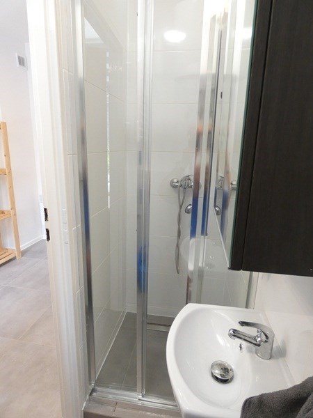 Łazienka z WC: kabina prysznicowa, umywalka, pralka.