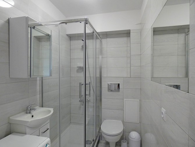 Łazienka: kabina prysznicowa, umywalka, pralka, szafki, WC.
