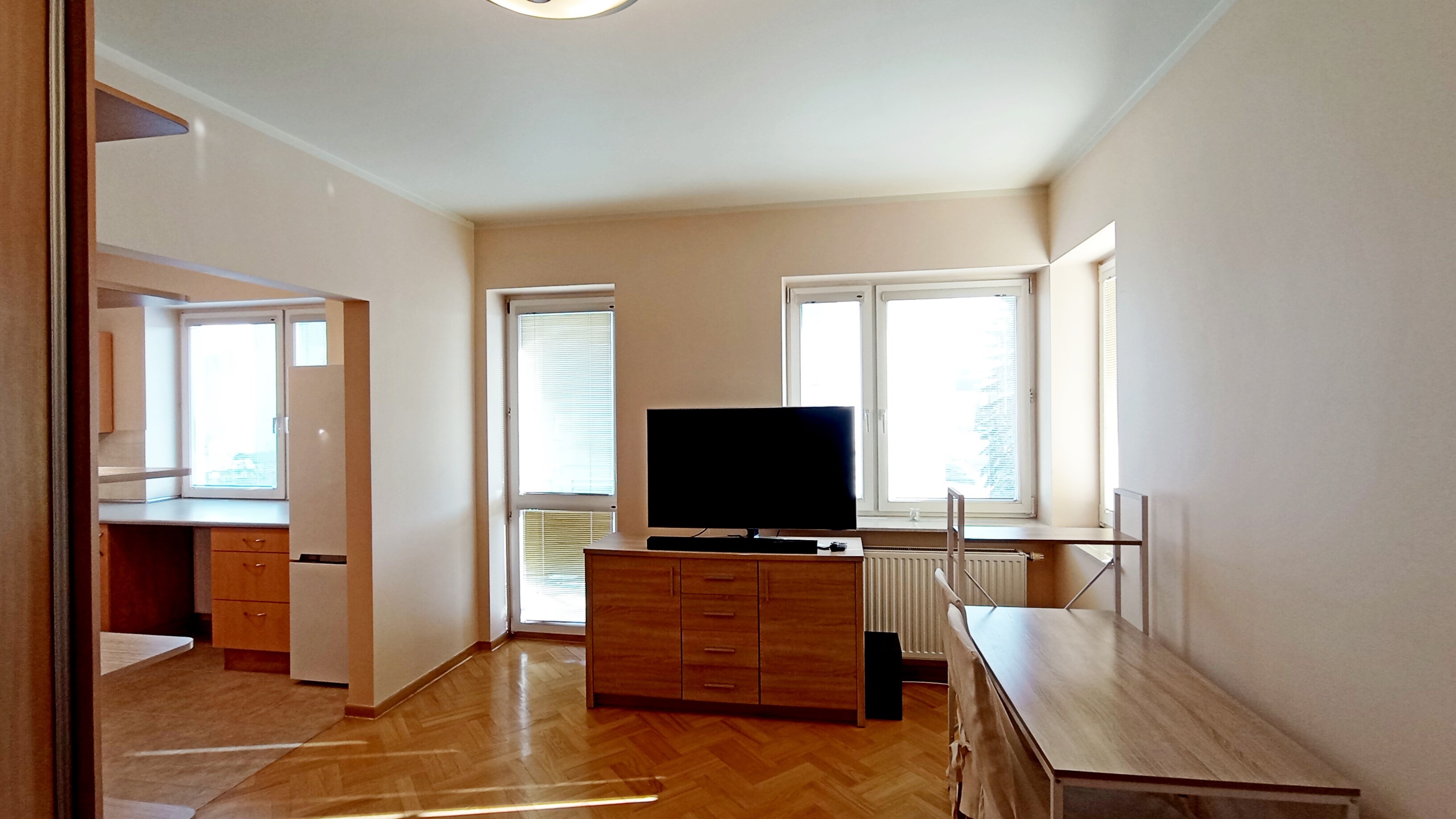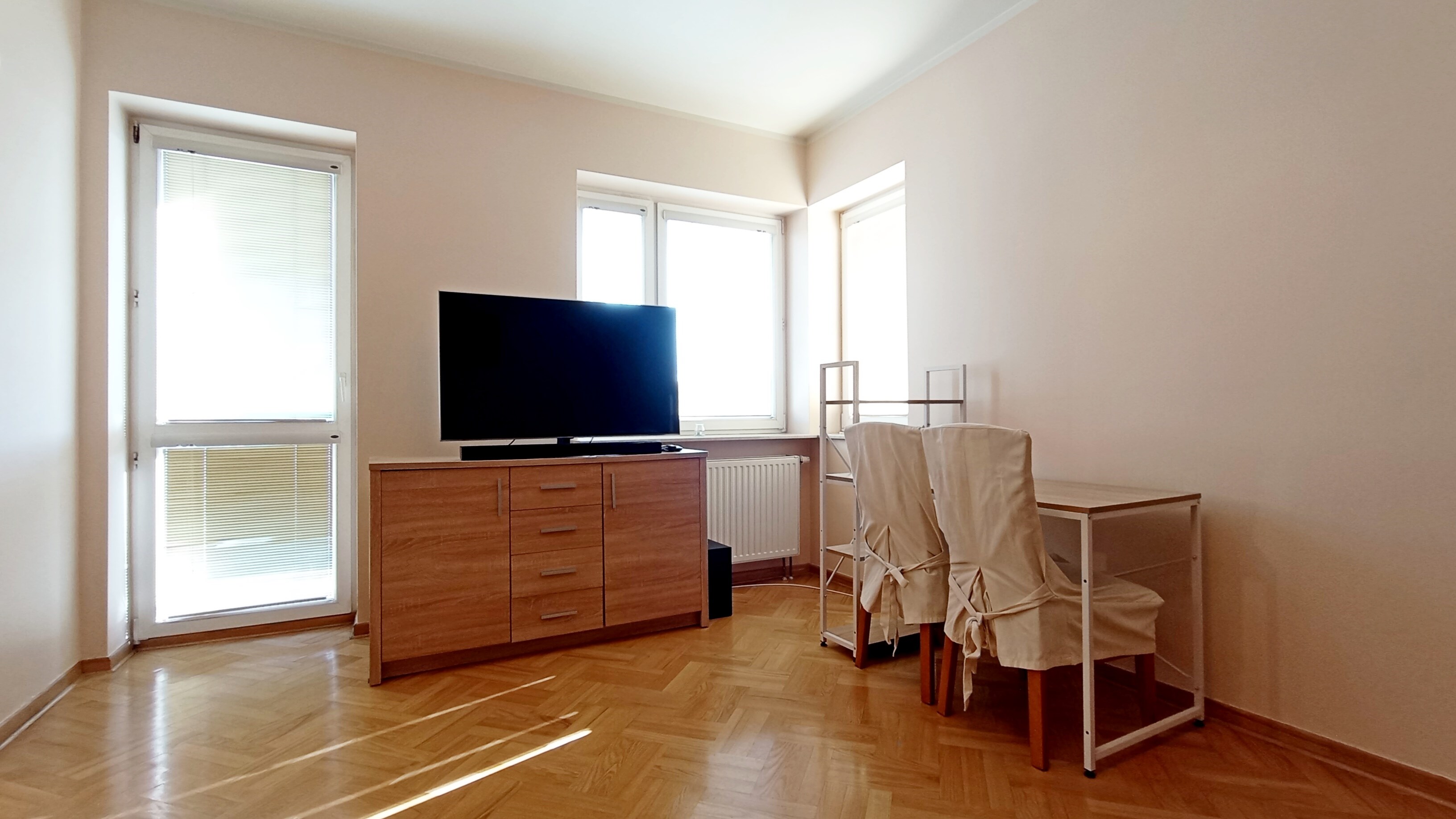 Salon: narożnik rozkładany, biurko + 2 krzesła, komoda, TV, soundbar, szafka trzyskrzydłowa.