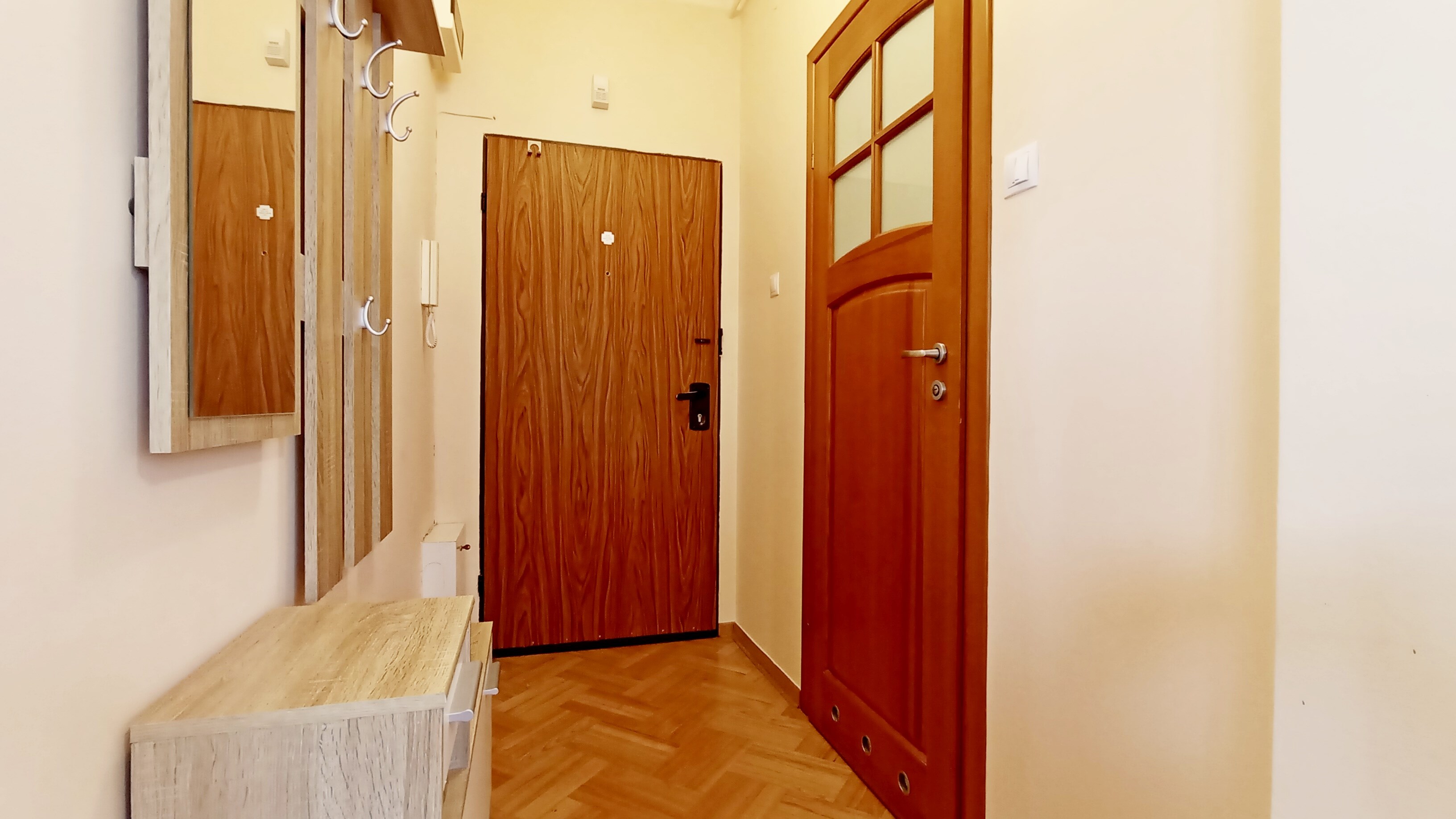 Przedpokój: szafka na buty, lustro, wieszak.