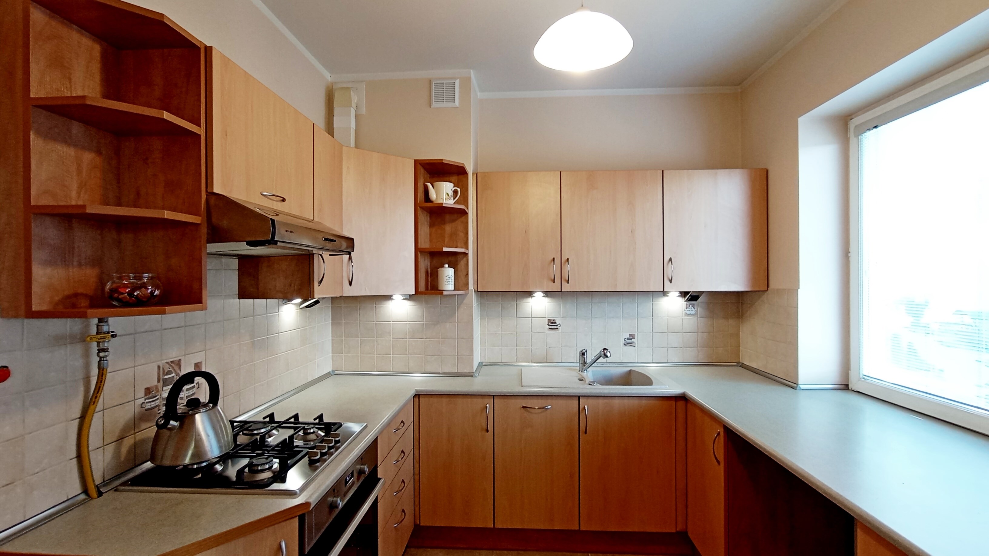 Kuchnia: lodówko-zamrażarka, zmywarka, okap, 4-palnikowa płyta gazowa, piekarnik, zlewozmywak.
