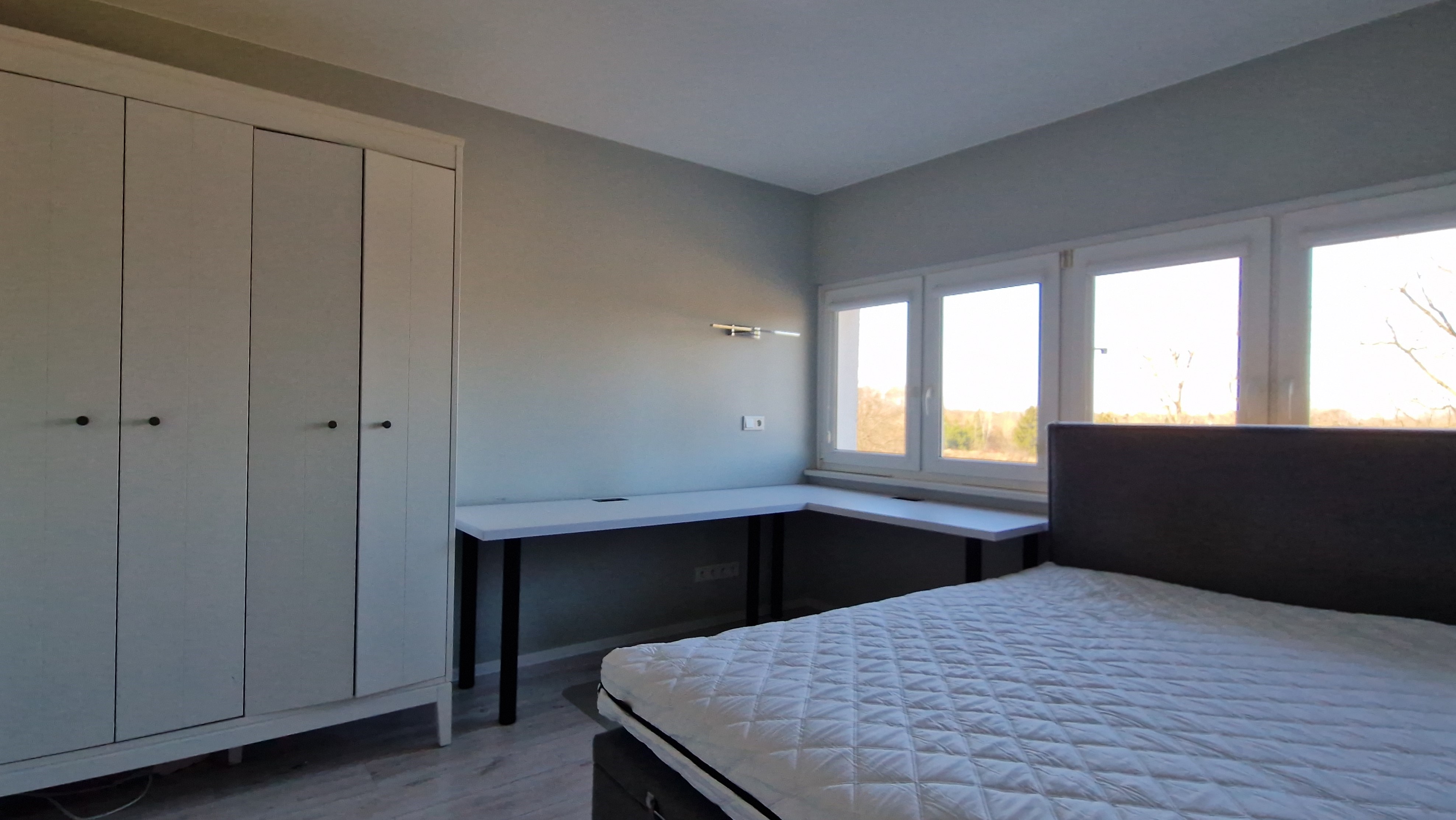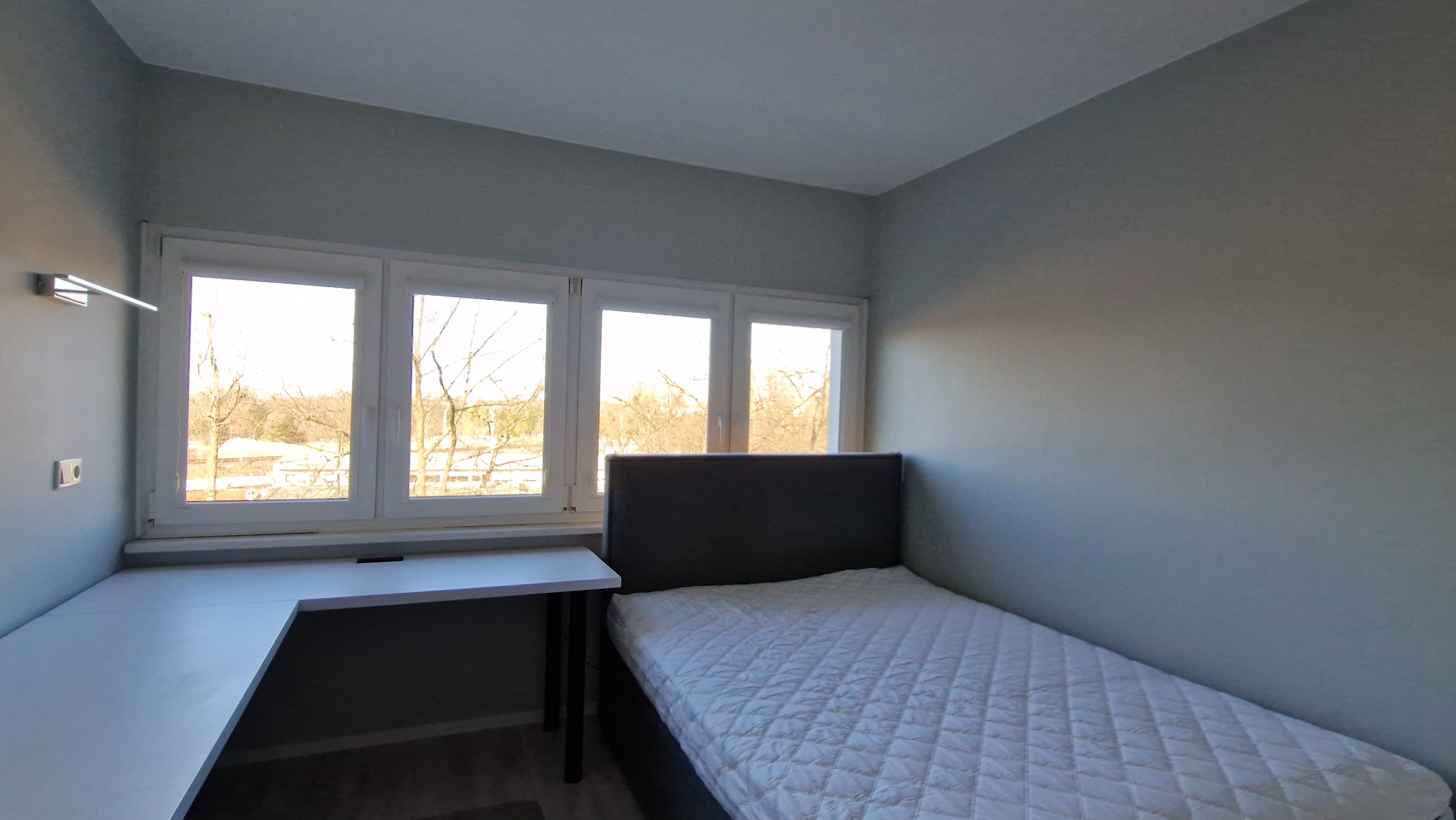 Pokój 2: łóżko z materacem, biurko, szafa.