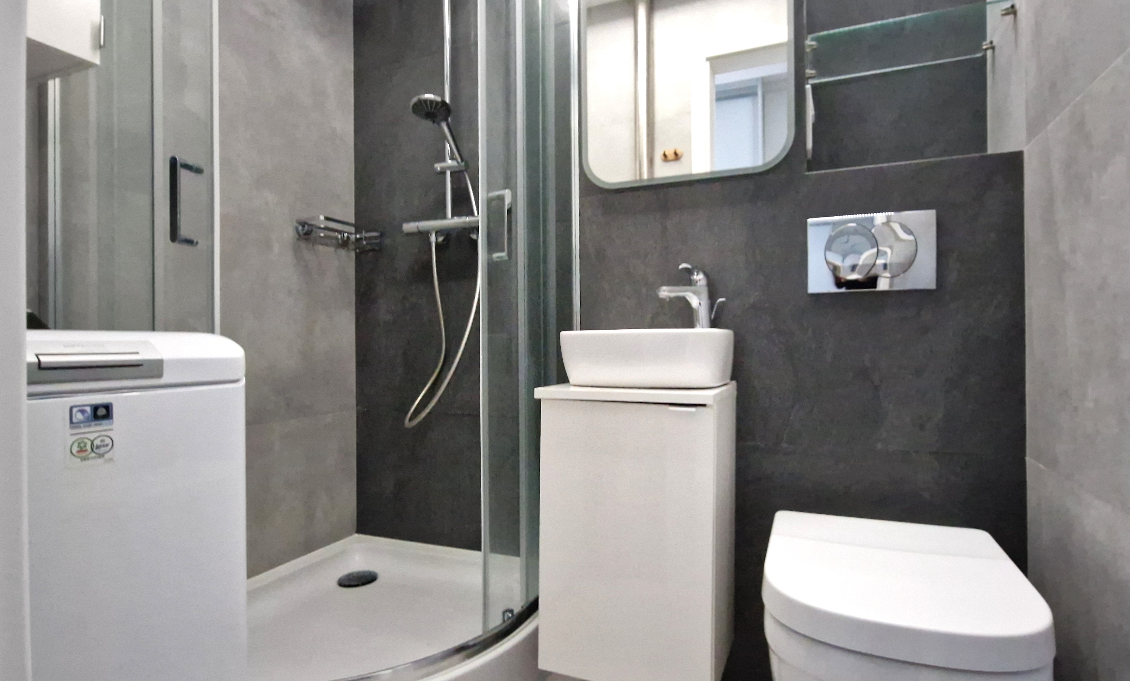 Łazienka razem z WC: kabina prysznicowa, umywalka, lustro, szafki, pralka.