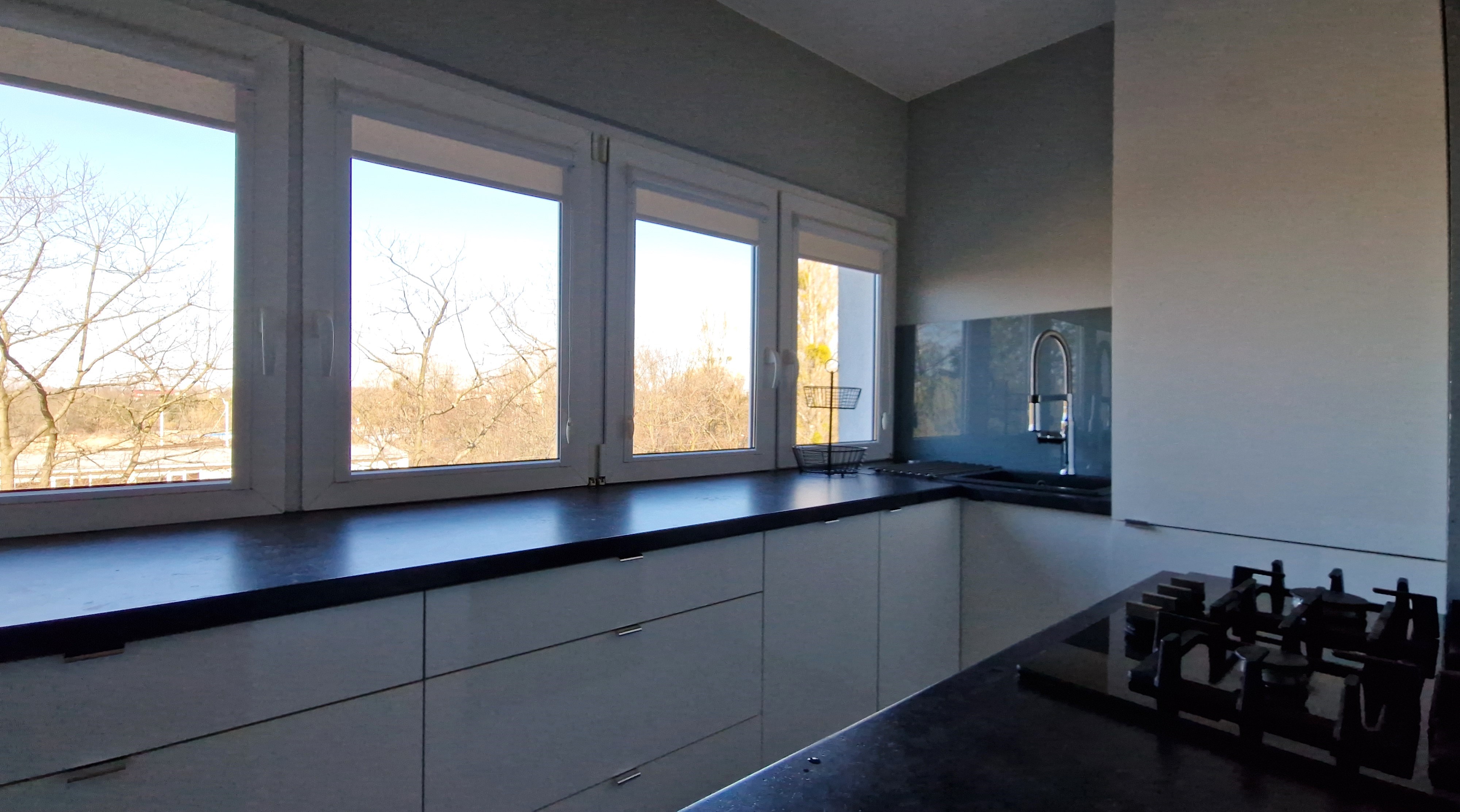 Kuchnia: szafki wiszące i stojące, lodówko-zamrażarka, zmywarka, piekarnik, czteropalnikowa płyta, okap, zlewozmywak.
