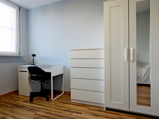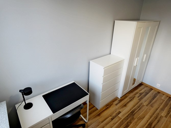 Pokój: pojedyncze łóżko, szafa, komoda, lampka, biurko + krzesło.