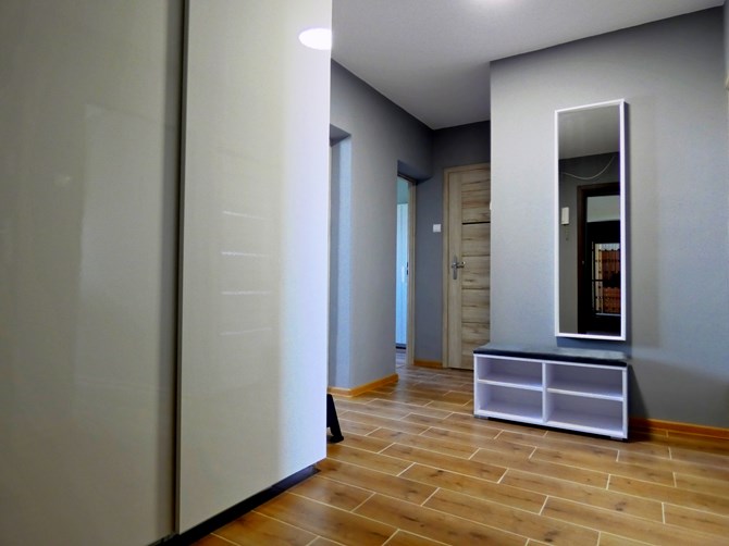 Przedpokój: szafa, pufa, lustro.