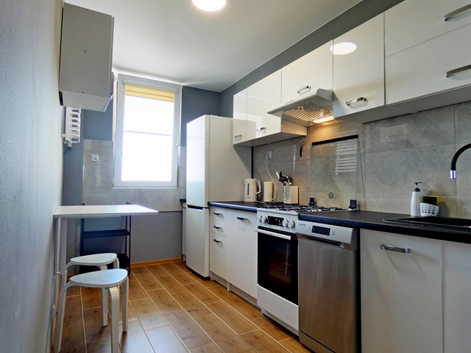 Kuchnia: lodówko-zamrażarka, okap, 4-palnikowa płyta gazowa, zmywarka, czajnik elektryczny, piekarnik, stolik + 2 taborety, zlew z ociekaczem.