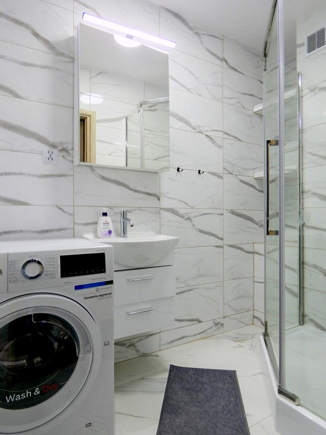 Łazienka: pralko-suszarka, prysznic, umywalka.