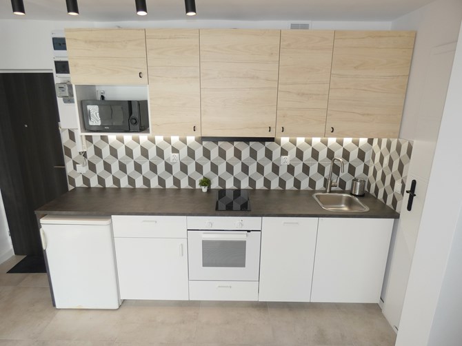 Kawalerka składa się z przestronnego pokoju, aneksu kuchennego, łazienki oraz przedpokoju.