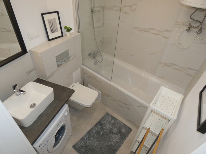 Łazienka: wanna z parawanem, pralka, WC, szafka z umywalką, lustro, regał z półkami na kosmetyki.
