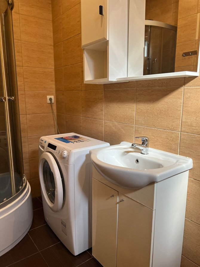 Łazienka: umywalka, zlew, pralka, kabina prysznicowa