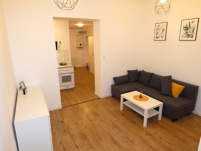 Pokój nr 1: kanapa stolik, komoda.
