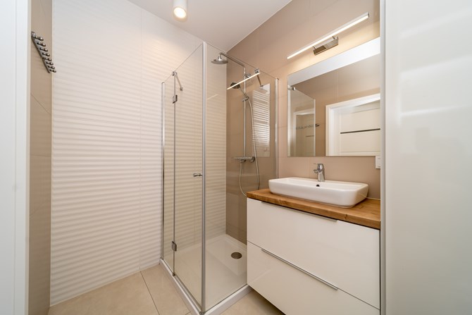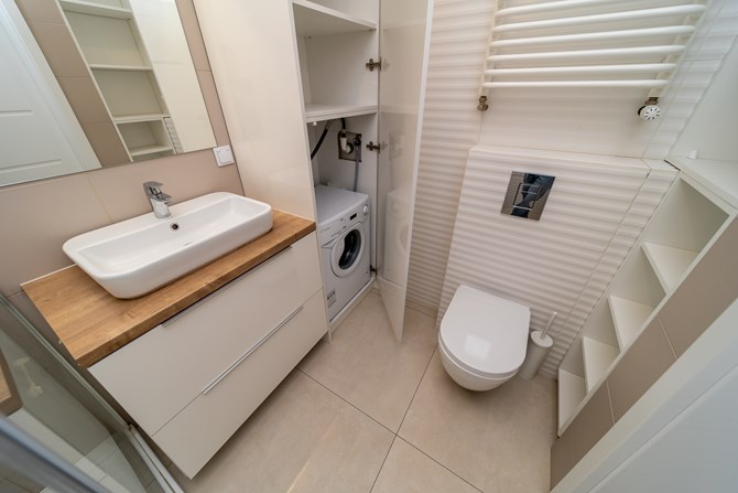 Łazienka: prysznic, szafka, umywalka, pralka, WC.