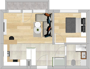 Składa się z przedpokoju, łazienki, salonu z aneksem kuchennym i sypialni.