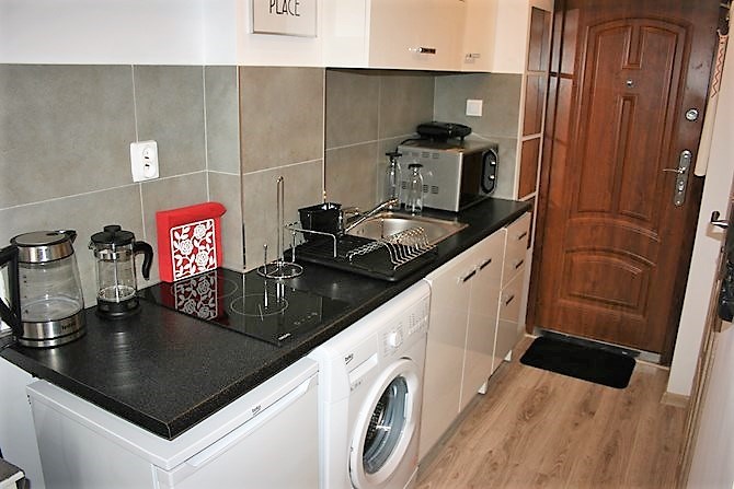 Aneks kuchenny: lodówka, kuchenka, mikrofalówka, czajnik elektryczny, okap, zlew, szafki wiszące i stojące, czajnik, toster, żelazko.