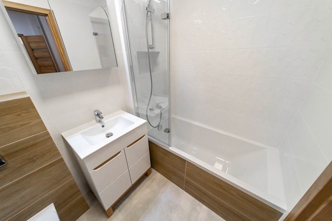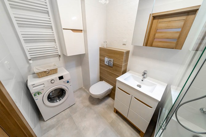 Łazienka (z WC): wanna, umywalka z szafką, pralka, lustro.
