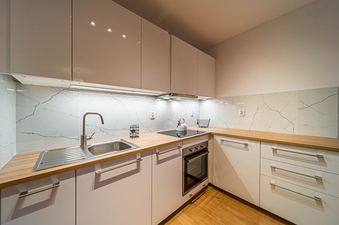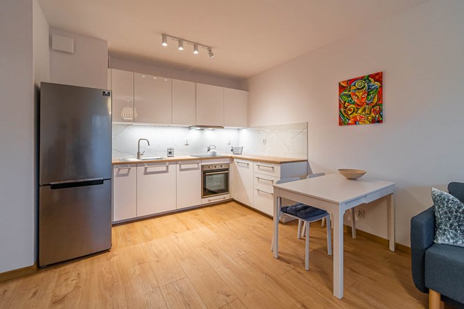 Aneks kuchenny: szafki wiszące i stojące, kuchenka, czteropalnikowa płyta indukcyjna, pralka, okap, zmywarka.
