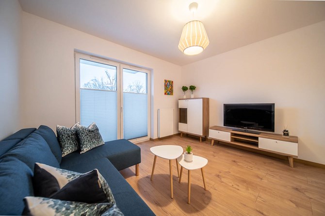Pokój 1: rozkładana kanapa, komoda, szafka RTV, stolik, TV.
