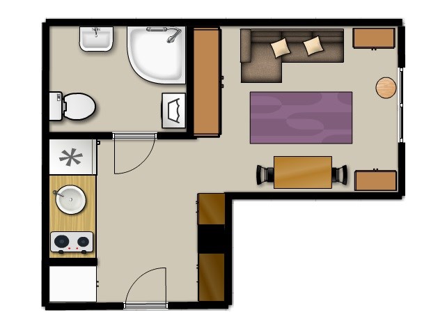 Pokój: narożnik, szafa wnękowa, szafka stojąca oraz stół z dwoma krzesłami.