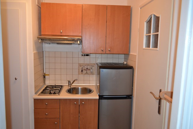 Kuchnia: szafki wiszące i stojące, lodówka z zamrażalnikiem i kuchenka gazowa.