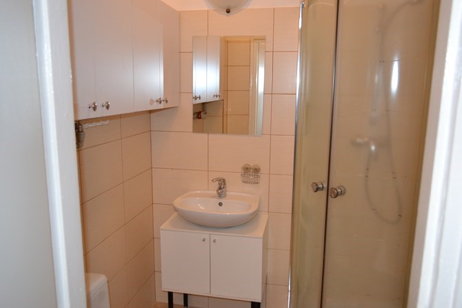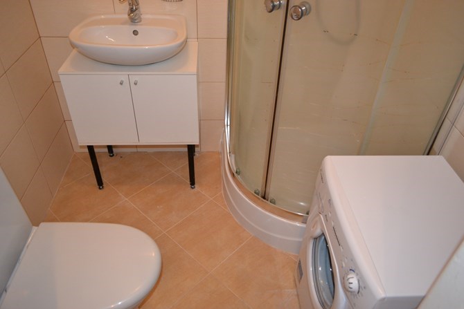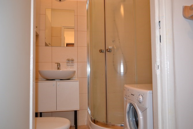 Łazienka: prysznic, szafki wiszące, pralka i lustro.