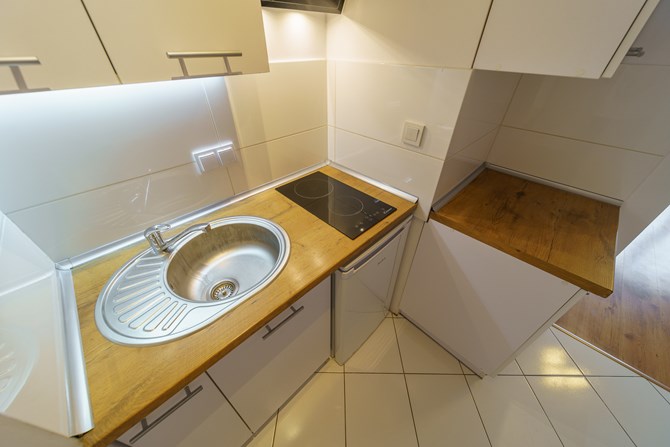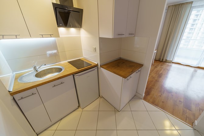 Kuchnia: zabudowa kuchenna, płyta ceramiczna 2-palnikowa, lodówka, okap.