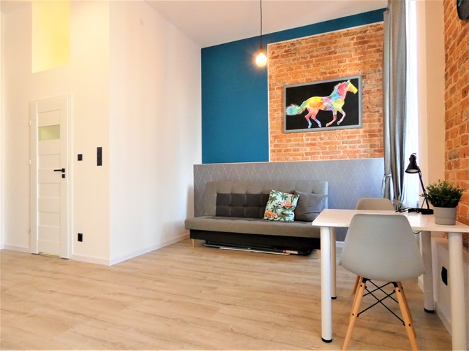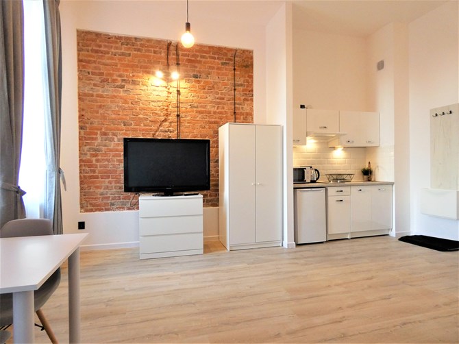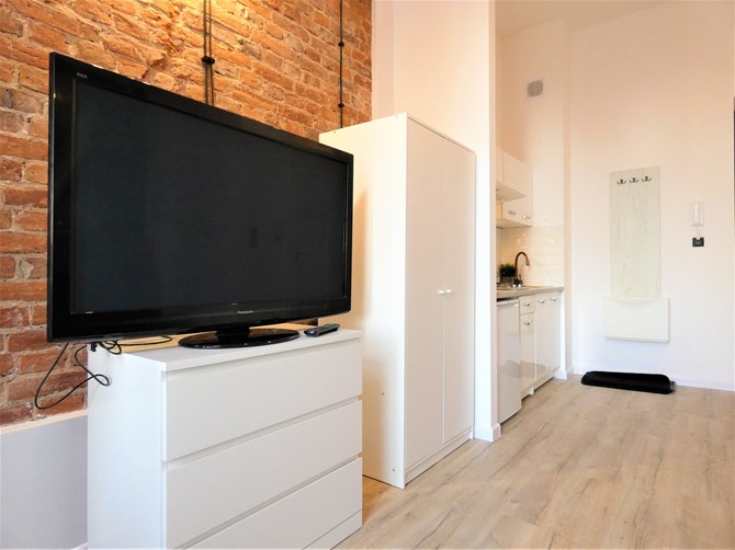 Mieszkanie składa się z pokoju z aneksem kuchennym oraz łazienki z kabiną prysznicową.