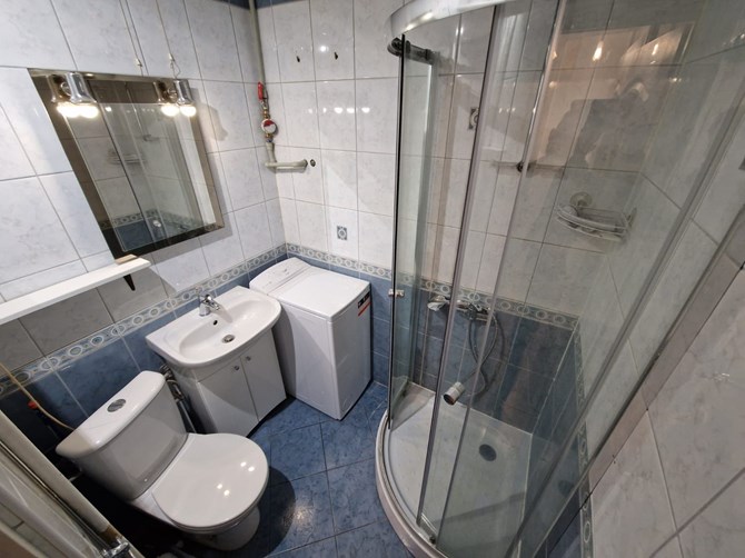Łazienka: kabina prysznicowa, pralka, umywalka z szafką oraz WC