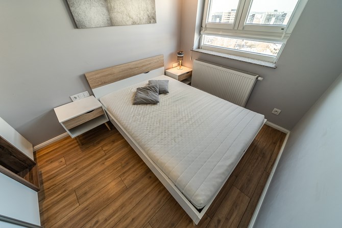 Sypialnia: duża zabudowana szafa, wygodne łózko z materacem, szafka nocna.