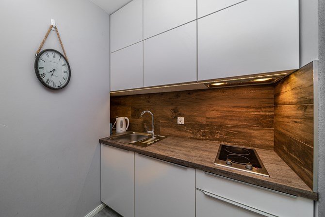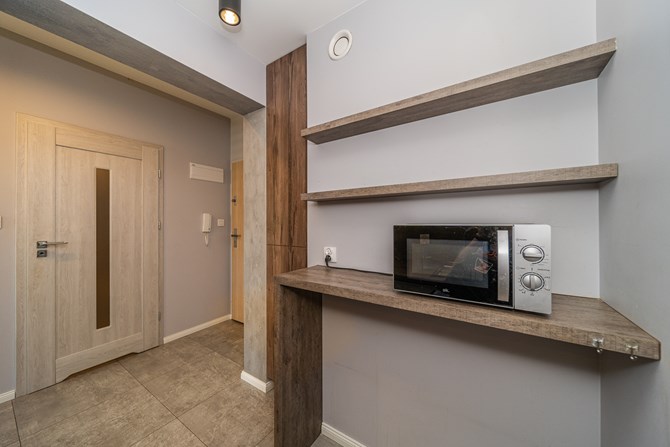 Kuchnia: zabudowane szafki wiszące i stojące, wnęka z półkami, stół- blat, lodówka zabudowana, płyta ceramiczna 2- palnikowa, czajnik elektryczny, mikrofalówka.