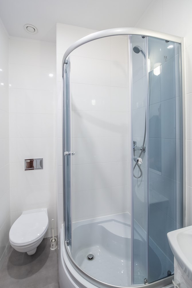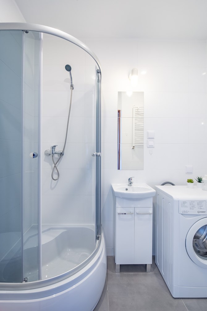 Łazienka razem z WC: lustro z półką, kabina prysznicowa, pralka.