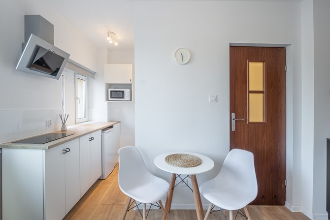 Aneks kuchenny: kuchni szafki wiszące i stojące, lodówka, dwupalnikowa płyta, zlewozmywak.