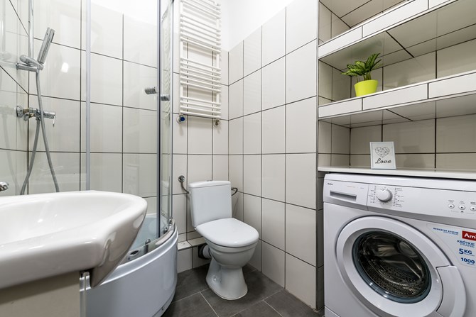 Łazienki: Obie wyposażone w prysznic, WC, umywalkę. W jednej łazience pralka.
