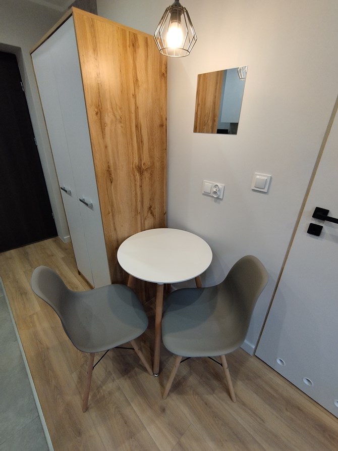 Pokój: rozkładana kanapa, 1x stół, 2x krzesła, stolik, szafa.