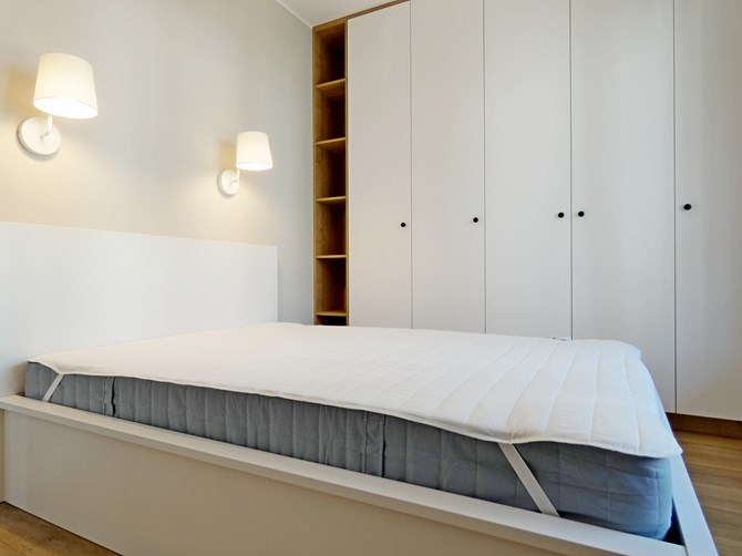 Sypialnia: podwójne łóżko z materacem, szafa wnękowa, 2 x lampa nocna, toaletka, krzesło.