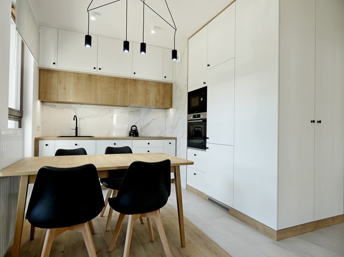 Kuchnia: lodówko-zamrażarka, okap, 4-palnikowa płyta indukcyjna, zmywarka, mikrofalówka, piekarnik, zlew.