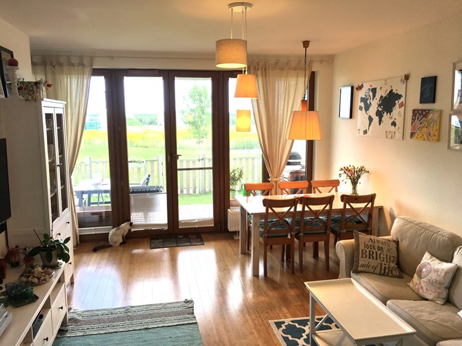 W pokojach pełne wyposażenie: stół z krzesłami, sofa, komody, półki, łóżka lub kanapy rozkładane.
