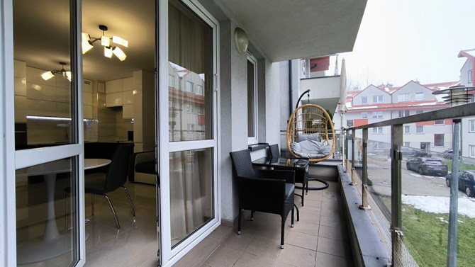 Balkon: stół ogrodowy, 2 fotele ogrodowe, fotel wiszący, ogrodowy.