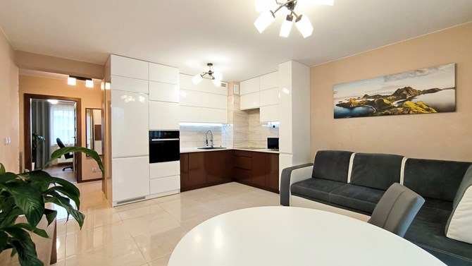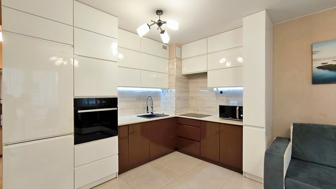 Aneks kuchenny: lodówko-zamrażarka, okap, płyta indukcyjna, zmywarka, piekarnik, zlewozmywak, mikrofalówka.