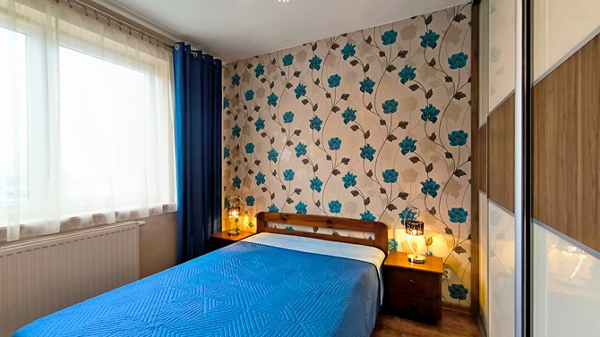 Sypialnia: łóżko podwójne, 2 szafki nocne, szafa 3D w zabudowie.
