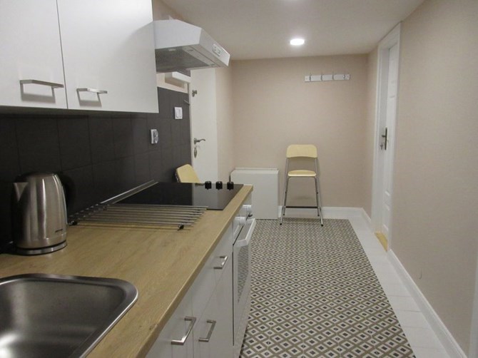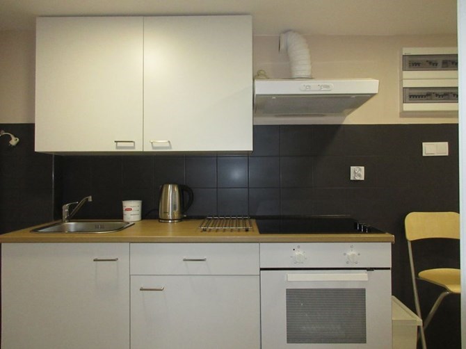 Aneks kuchenny: szafki, kuchenka elektryczna, mikrofalówka, okap, zlewozmywak, lodówko-zamrażarka.