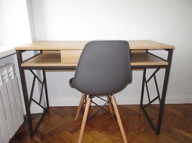 Pokój: szafa, biurko, krzesło, sofa.