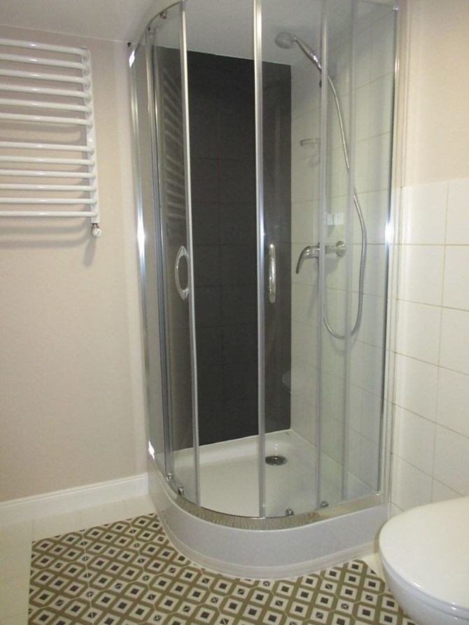 Łazienka: kabina prysznicowa, WC, umywalka, lustro, pralka.