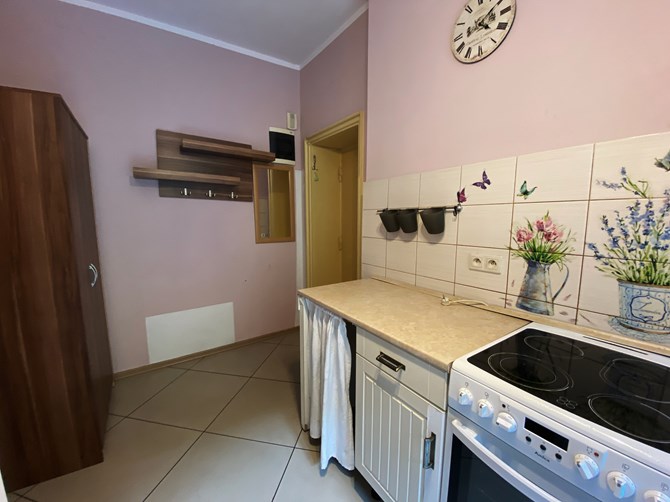 Łazienka (razem z WC): wanna, sedes, umywalka, pralka.